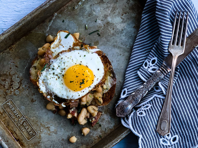 Toasted Cheese Bread with Bacon Rosemary Beans and a Fried Egg
